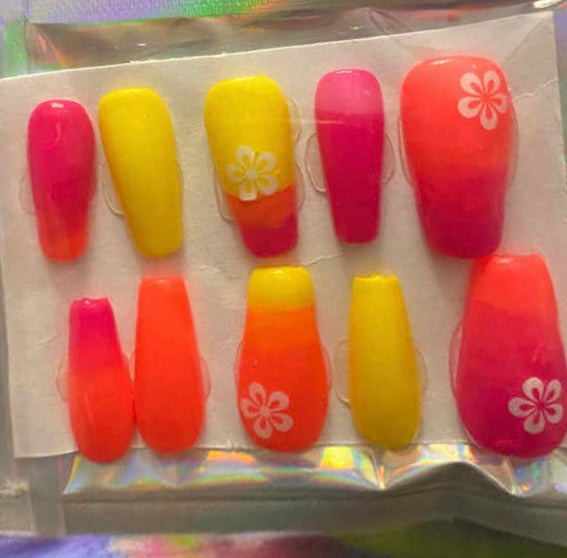 lemonade sunset ombré nails with Hawaiian flower nail art stickers - coffin shaped, size small- medium lenth